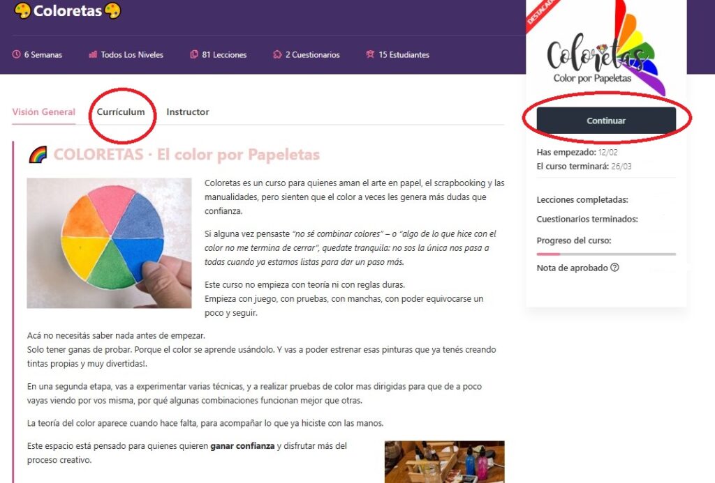 2- Si ves la palabra «continuar», significa que ya ingresaste al curso.