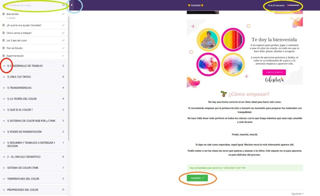 15 – El botón de completo hace que puedas medir el progreso de la cursada.